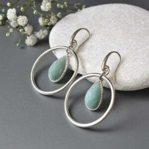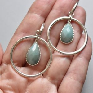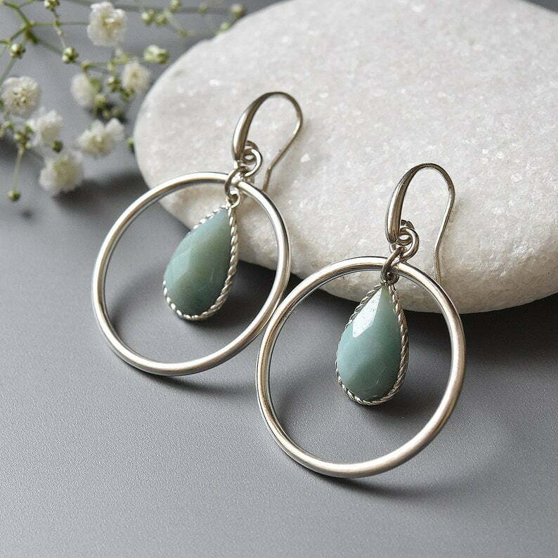 Large circle silver earrings with amazonite teardrops.