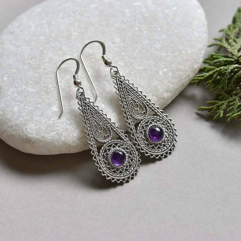 Tags: Amethyst Silver Filigree Earrings, Ethnic earrings, February birthstone, Israeli jewelry, Purple Dangle Drop earrings