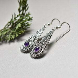 Delicate sterling silver filigree earrings in the shape of teardrop, decorated with amethyst stones.