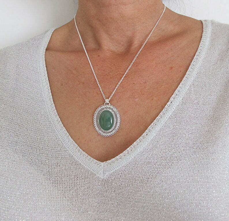Tags: Aventurine Silver necklace, Ethnic necklace, Filigree pendant, Israeli jewelry, Oval necklace