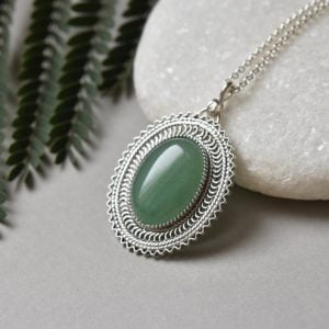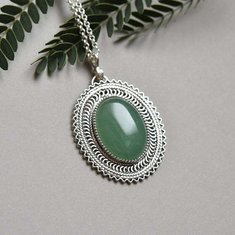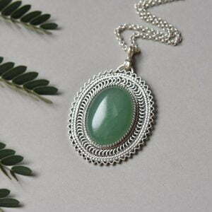 Silver filigree oval necklace decorated with green aventurine stone.