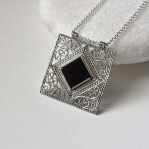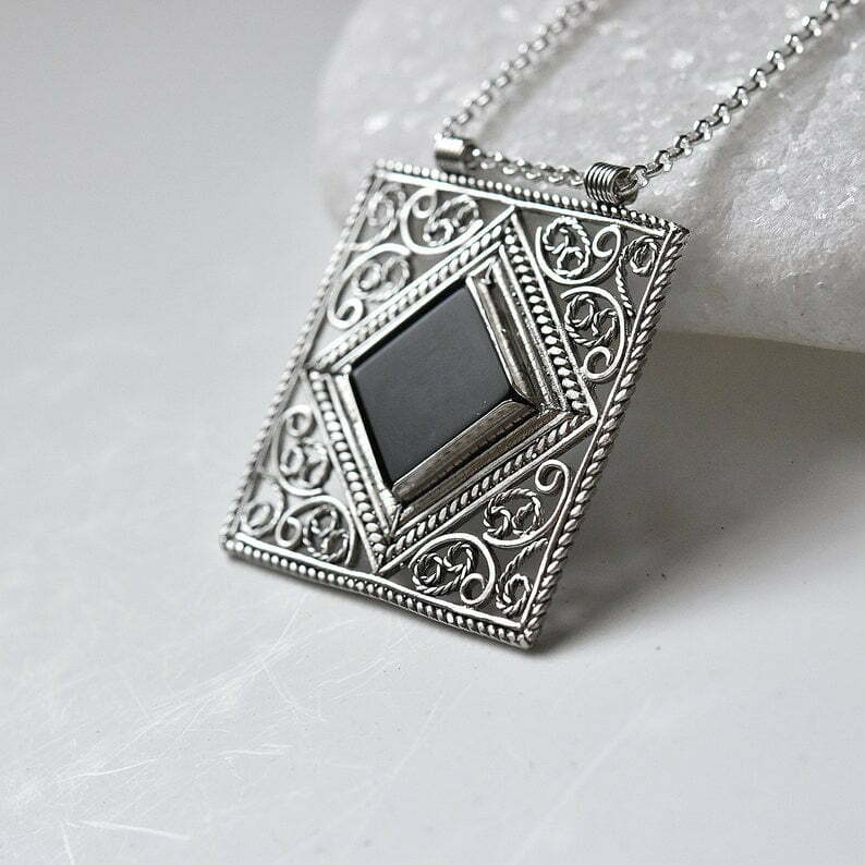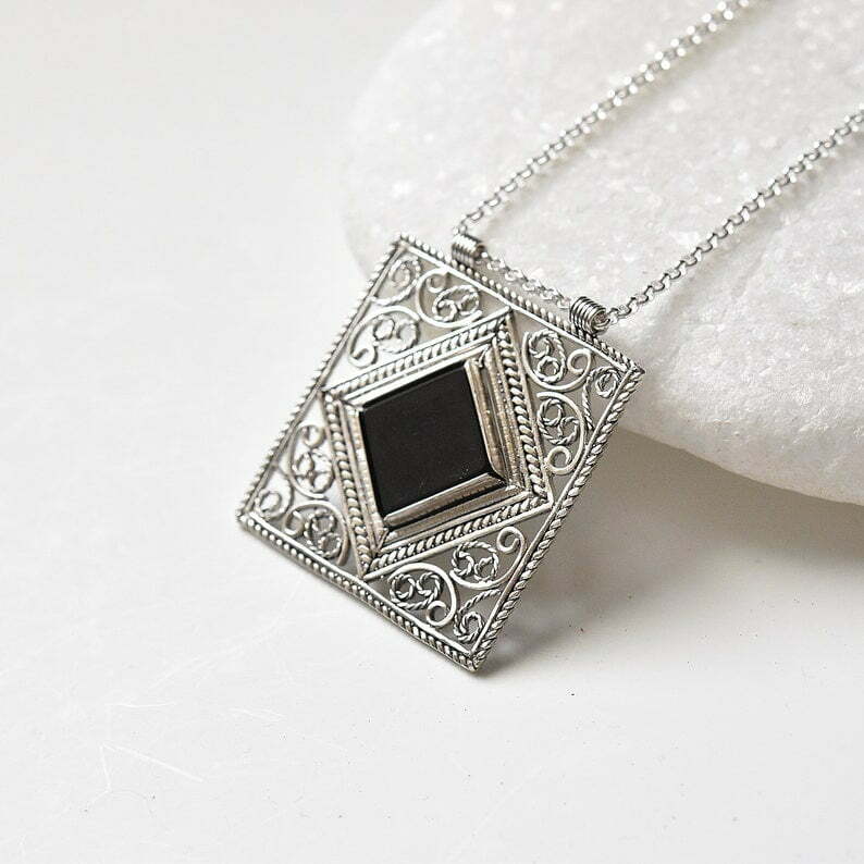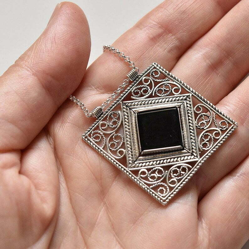 Tags: black onyx necklace, black onyx pendant, silver filigree pendant, square silver pendant, titleSquare necklace