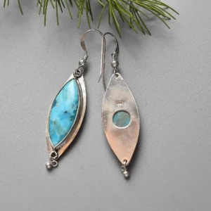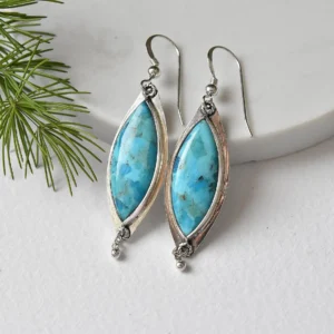 Delicate sterling silver marquise shape dangle earrings decorated with beautifulblue Mohave Turquoise stones.