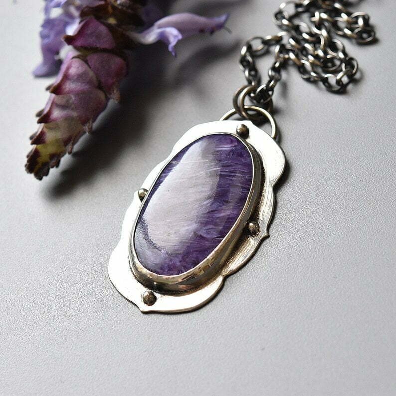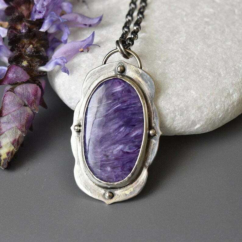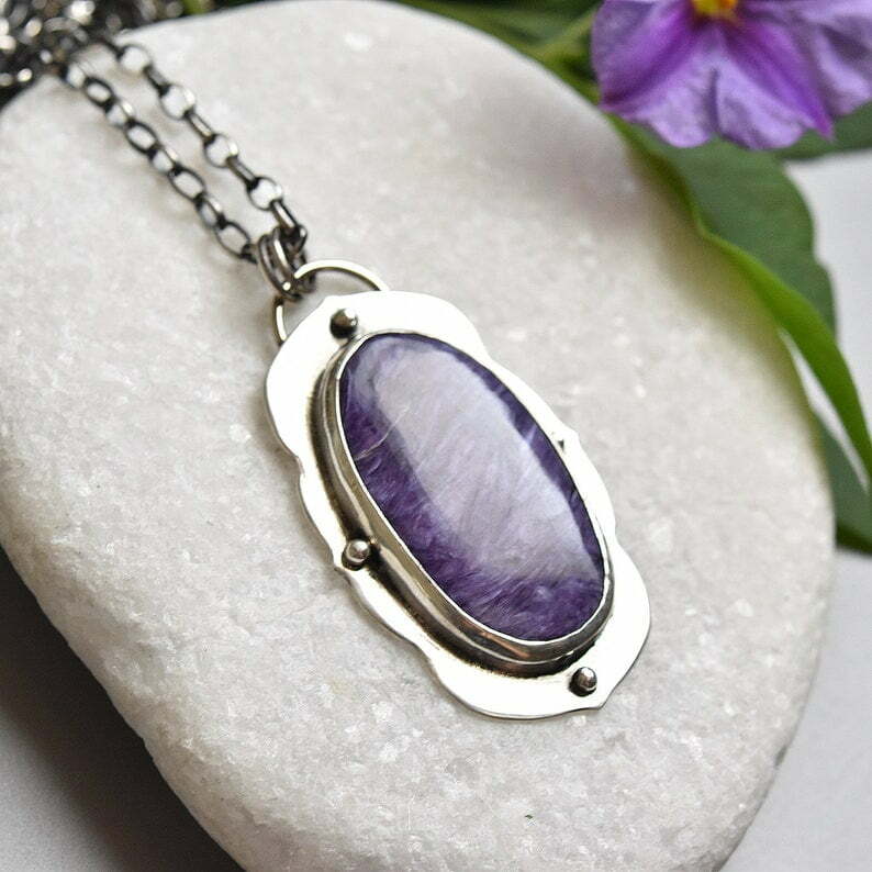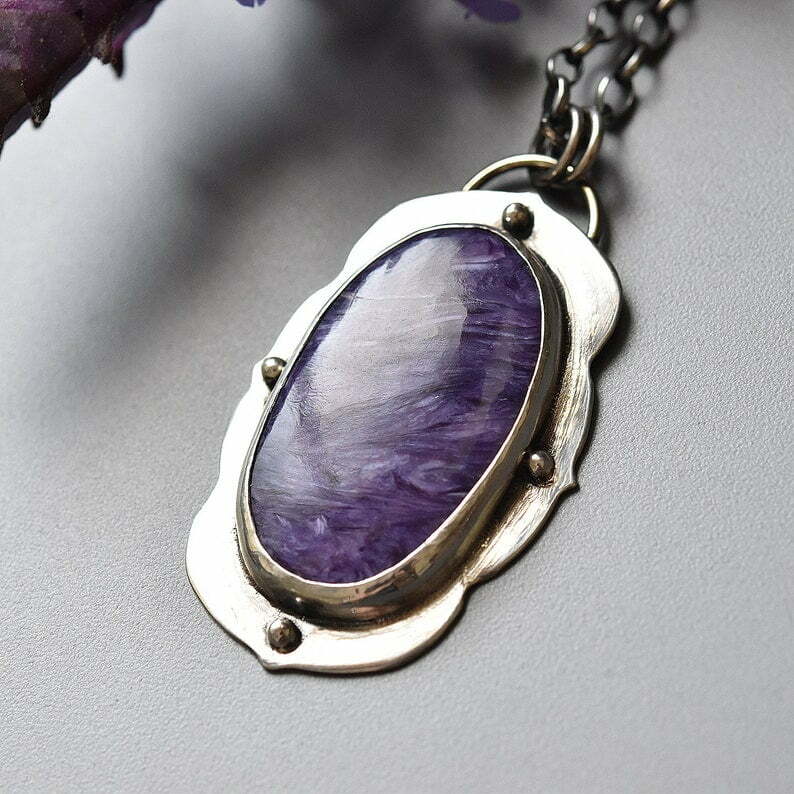 Tags: Large oval necklace, Purple charoite necklace, silver pendant