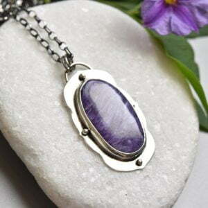 This necklace uses a natural and genuine charoite. The charoite has rich and vibrant purple colors. The signature pattern of charoite is intricate and detailed. Very high quality charoite. It is cut and set into a 925 sterling silver setting. Great way to wear this beautiful gemstone