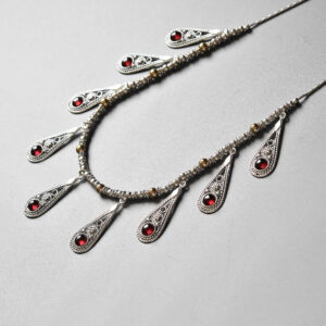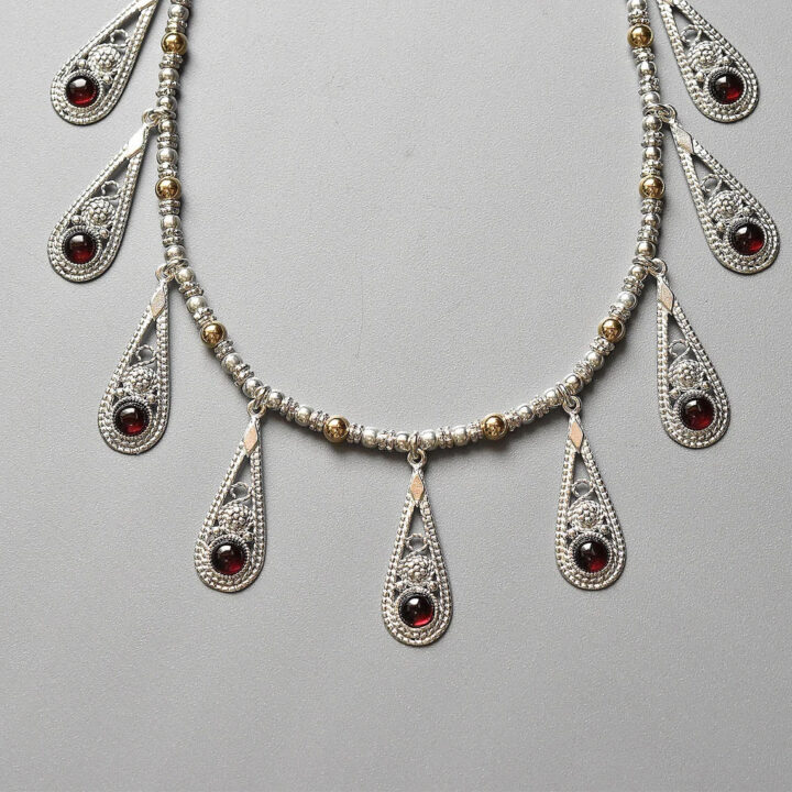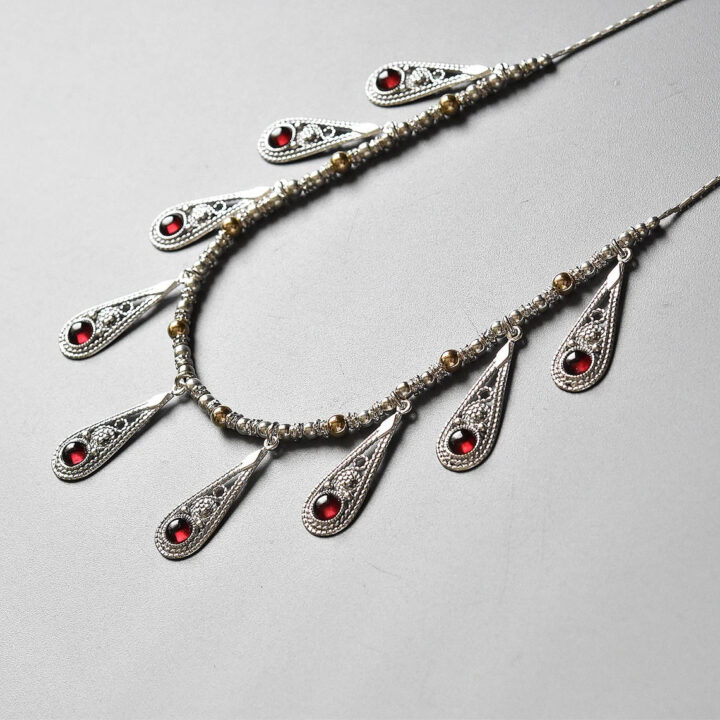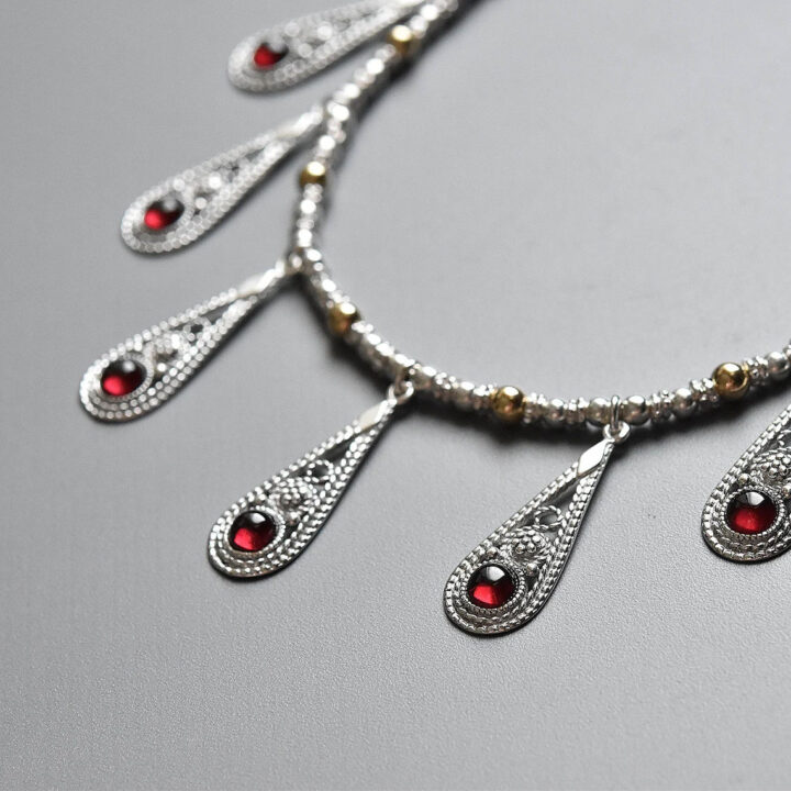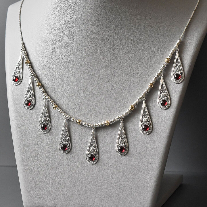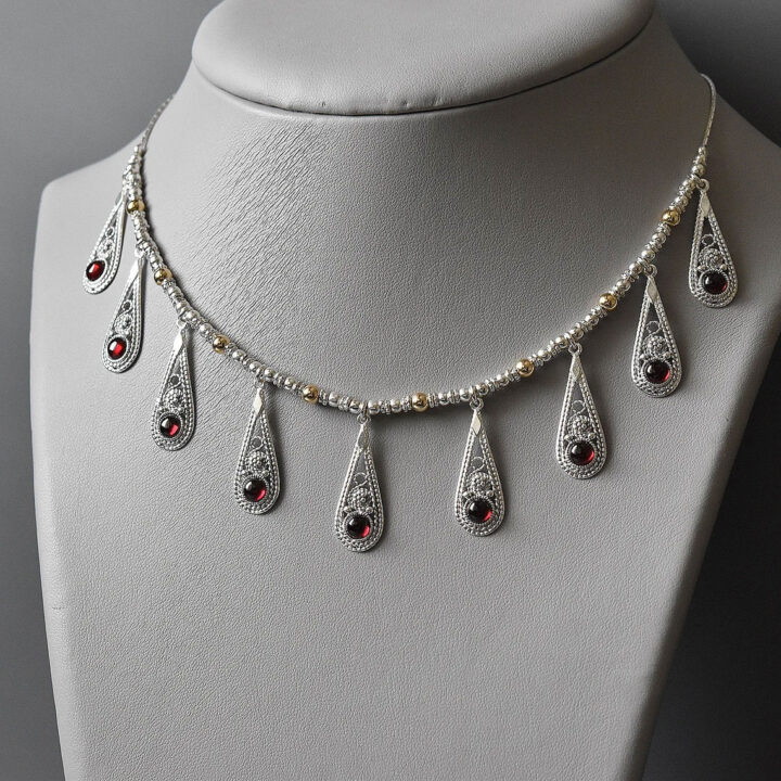 Traditional yemenite silver filigree multi drop necklace. Every drop decorated with garnet gemstone.