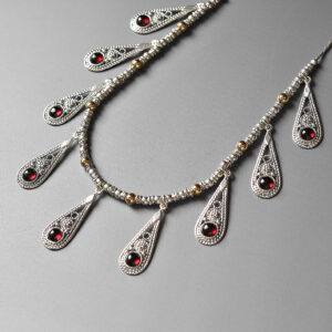 Amazing delicate filigree necklace in the shape of the bird with garnet stone in the middle