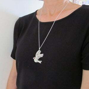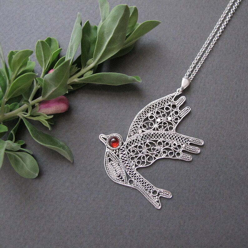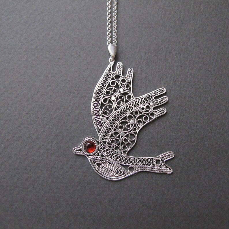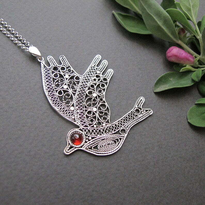 Tags: delicate bird pendant, grandmom gift, mommy jewelry, silver filigree garnet pendant, Sterling silver flying bird necklace
