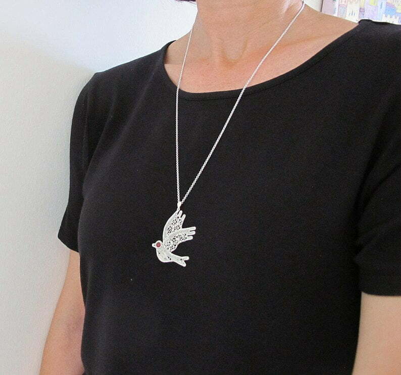 Sterling silver flying bird necklace, delicate bird pendant, silver filigree garnet pendant, grandmom gift, mommy jewelry