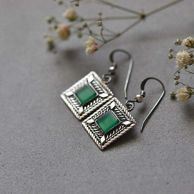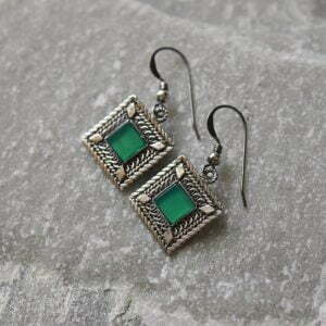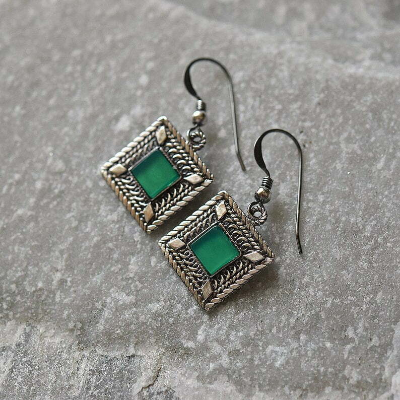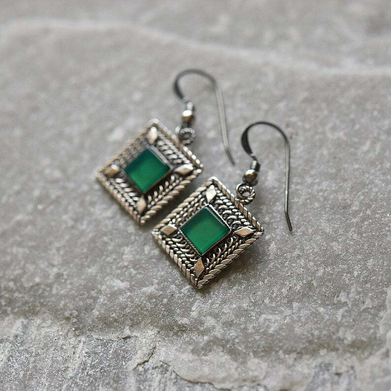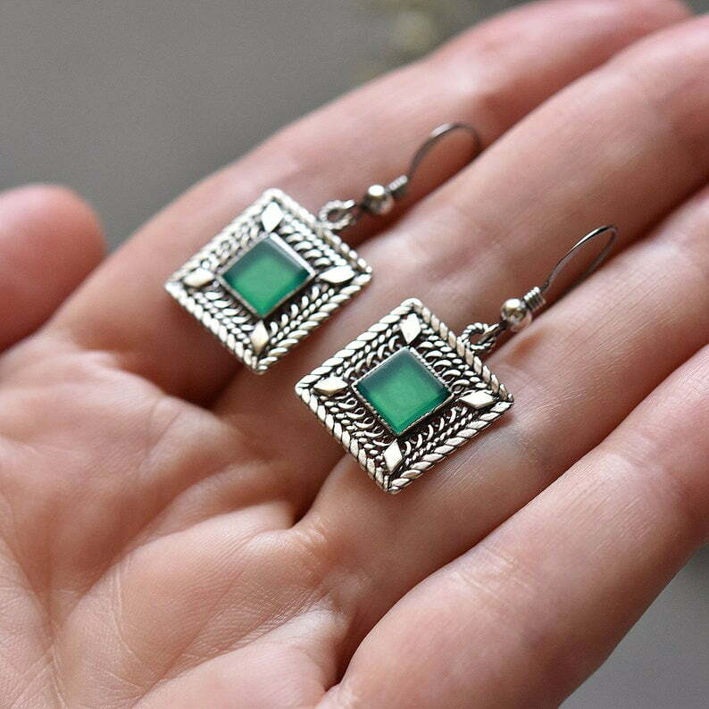 Tags: Green stone earrings, Israeli earrings, Silver filigree earings, Square earrings, yemenite earrings