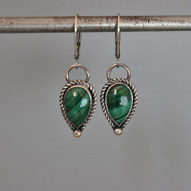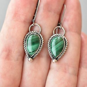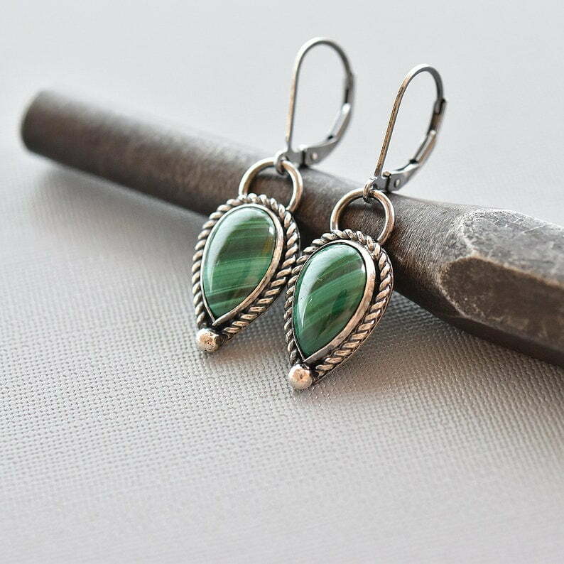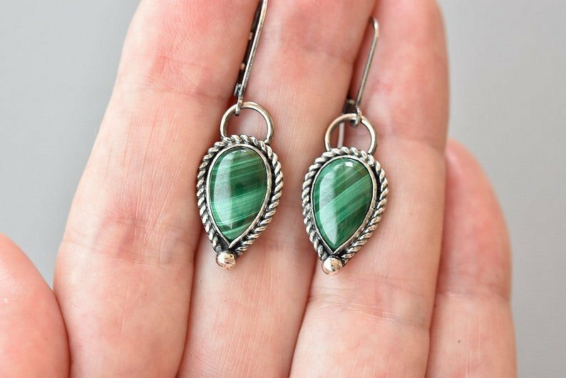 Tags: Green stone earrings, Malachite Silver Filigree teardrop earrings, Simple everyday minimalist style earrings