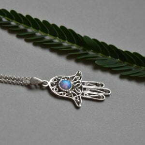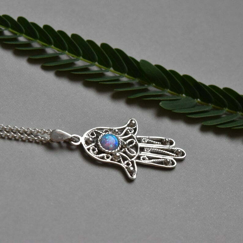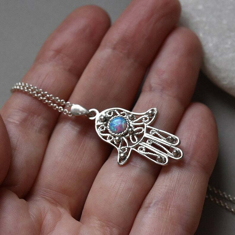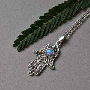 Delicated silver filigree Hamsa protection necklace with opal stone.