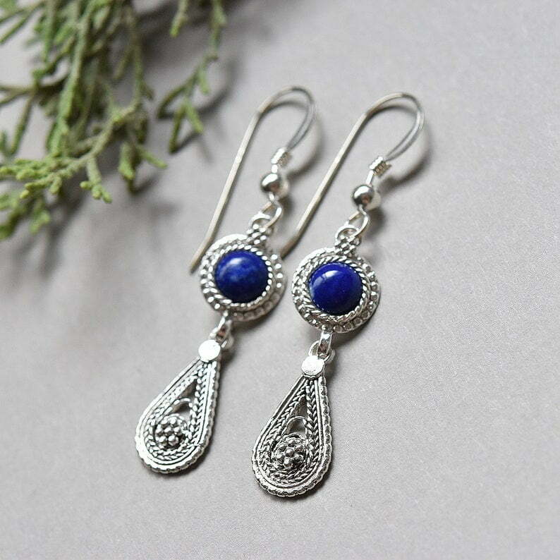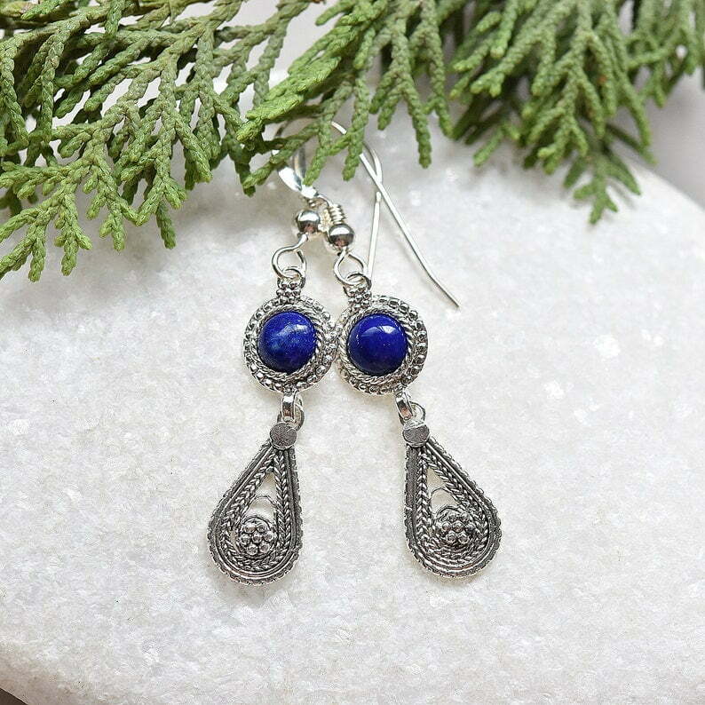 These fun earrings are composed of sterling silver and rich blue lapis lazuli cabochons. They decorated with traditional filigree yemenite tear drop.