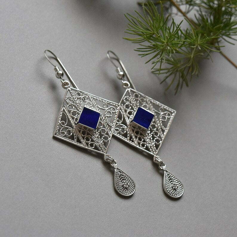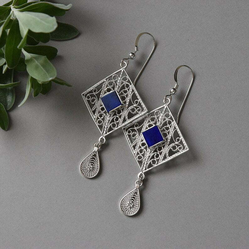 Delicate sterling silver filigree earrings decorated with Lapis lazuli stones and small silver filigree teardrops.