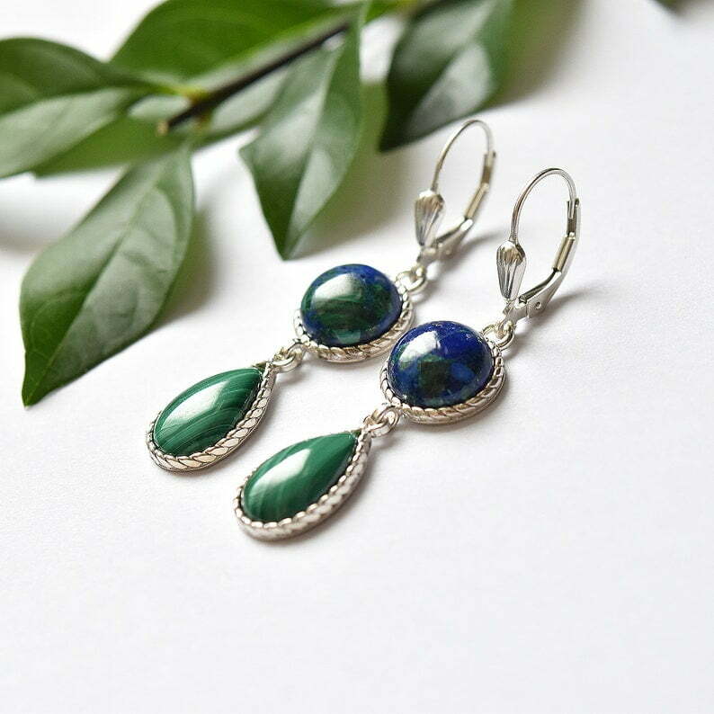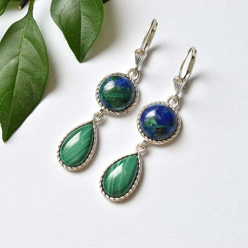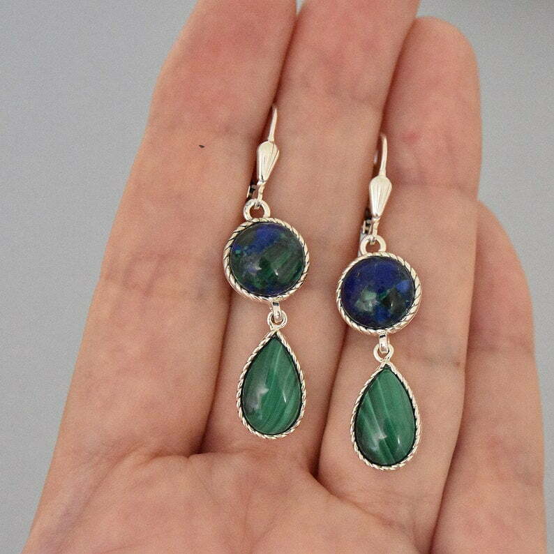 A delicate sterling silver earrings in the shape of drop, decorated with Malachite and Azurite stones.