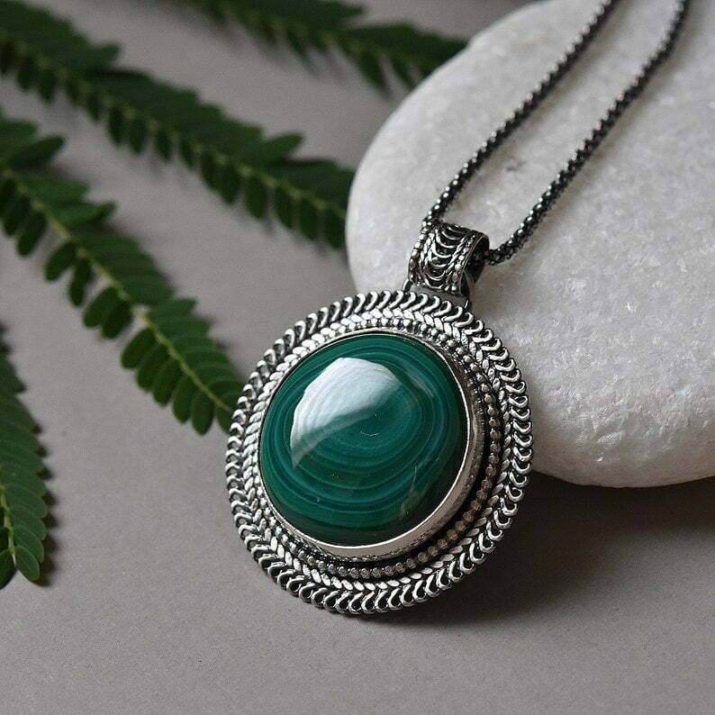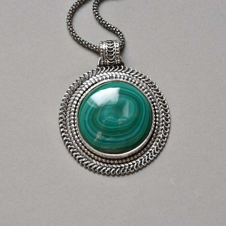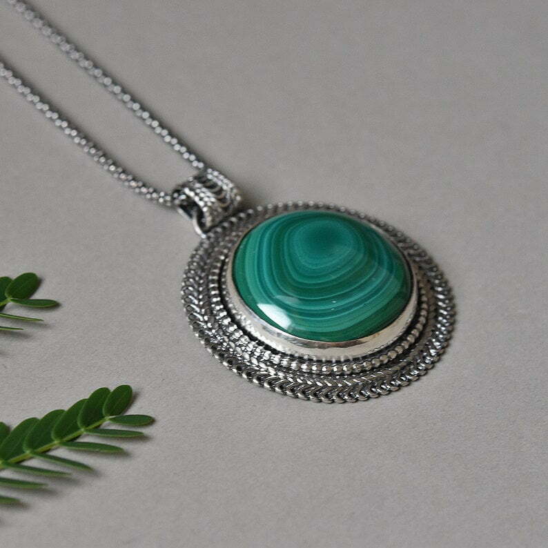 Tags: circle green pendant, handmade woman necklace, Malachite silver filigree necklace, unisex pendant