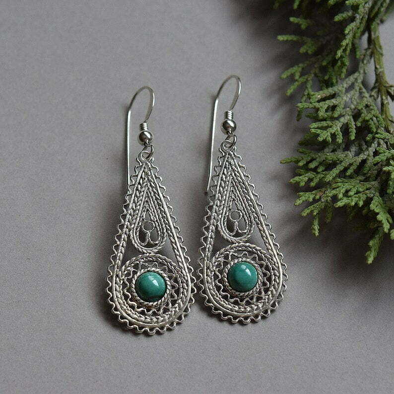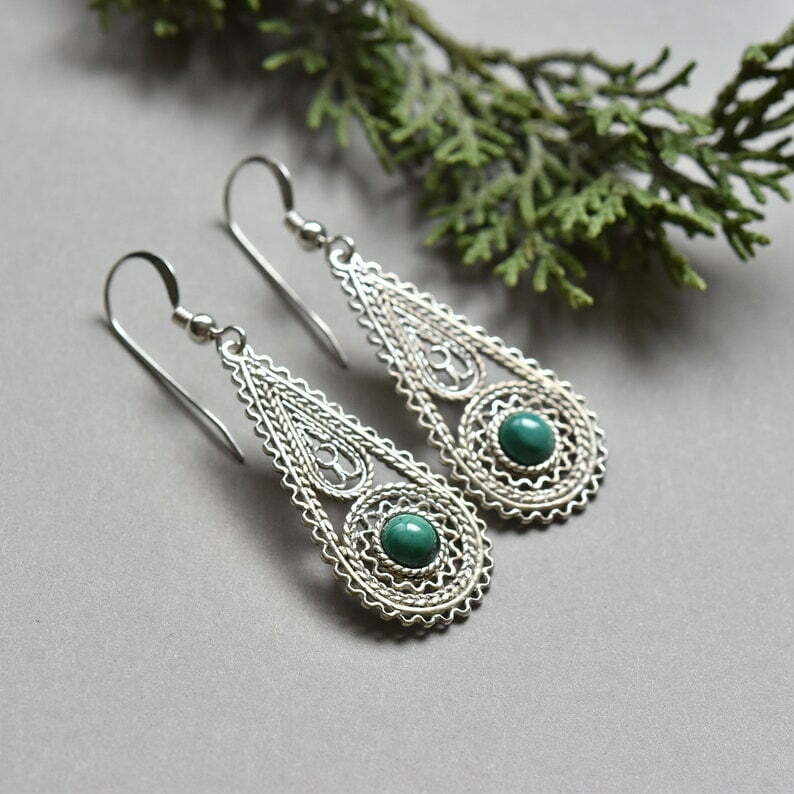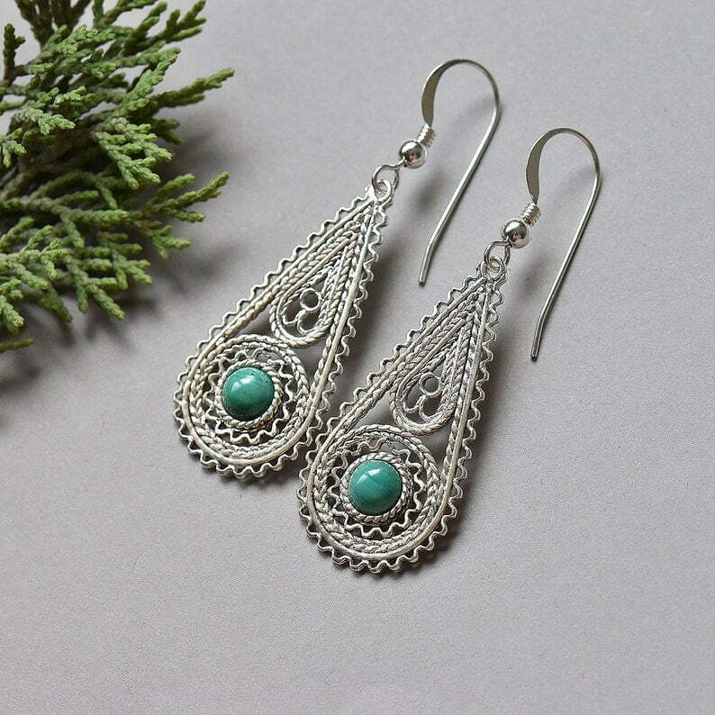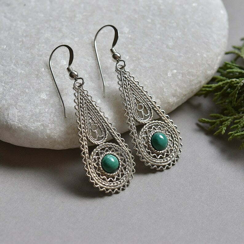 Beautiful silver filigree earrings decorated with malachite stones. Yemenite style and filigree