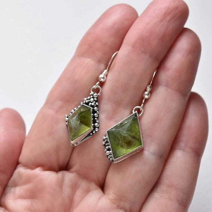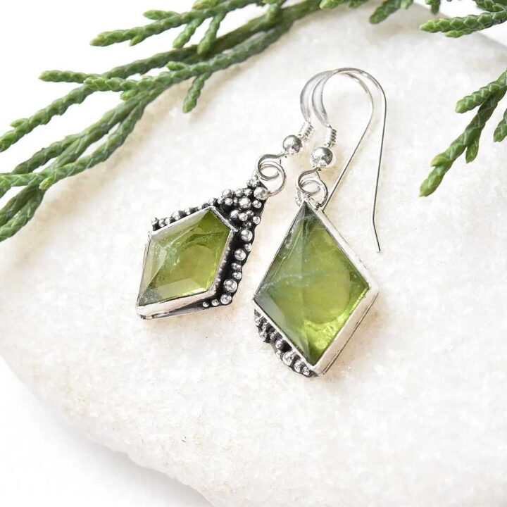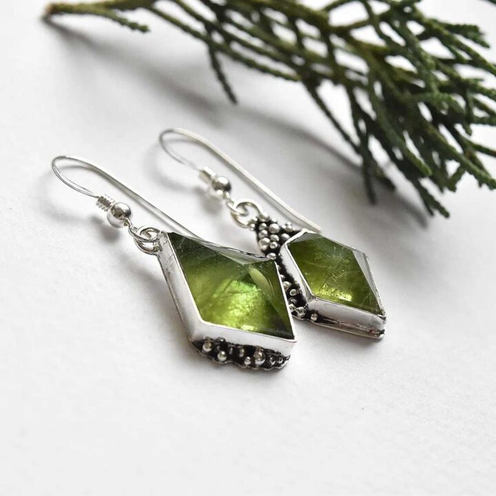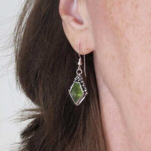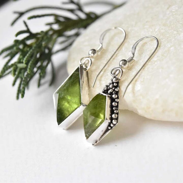 Aesthetic sterling silver mismatched earrings decorated with beautiful genuine peridot gemstones. Oxidized and polished.