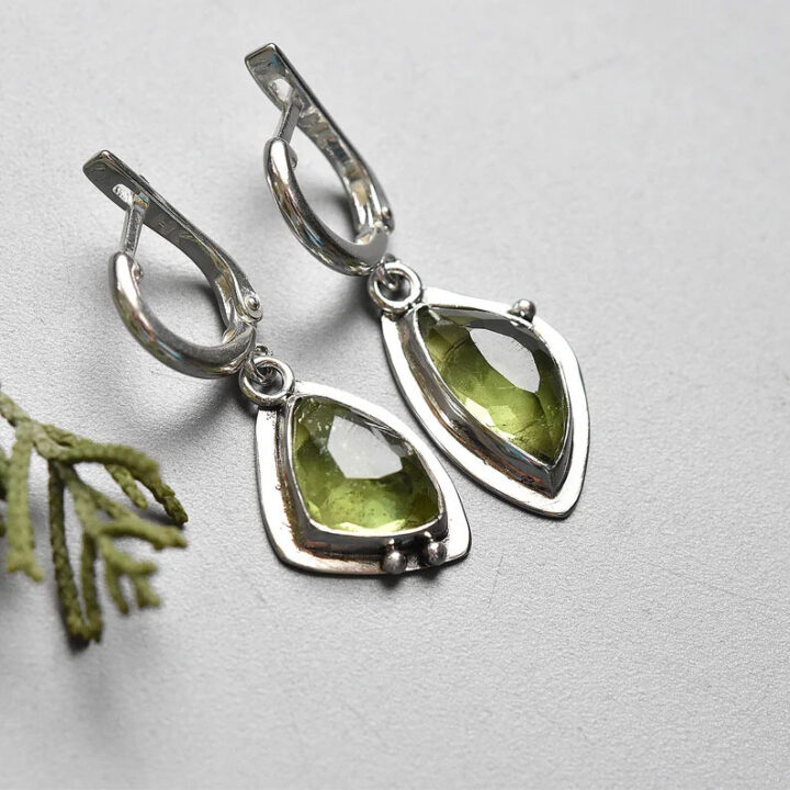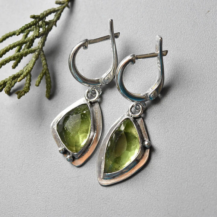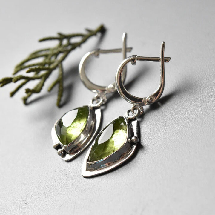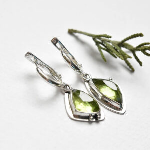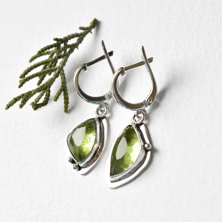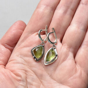 Aesthetic sterling silver mismatched lever back earrings decorated with beautiful genuine peridot gemstones.