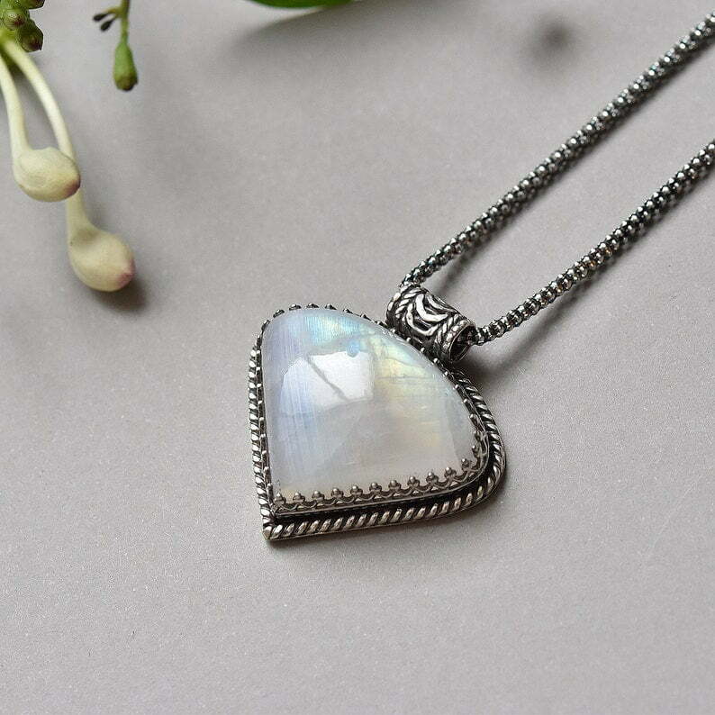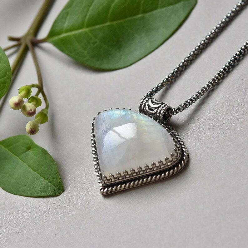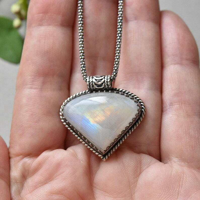 This handcrafted statement pendant features a gorgeous piece of Moonstone that has an incredible blue flash in the light!