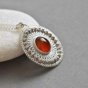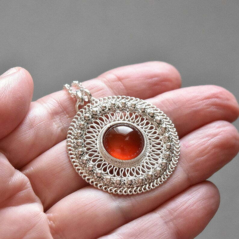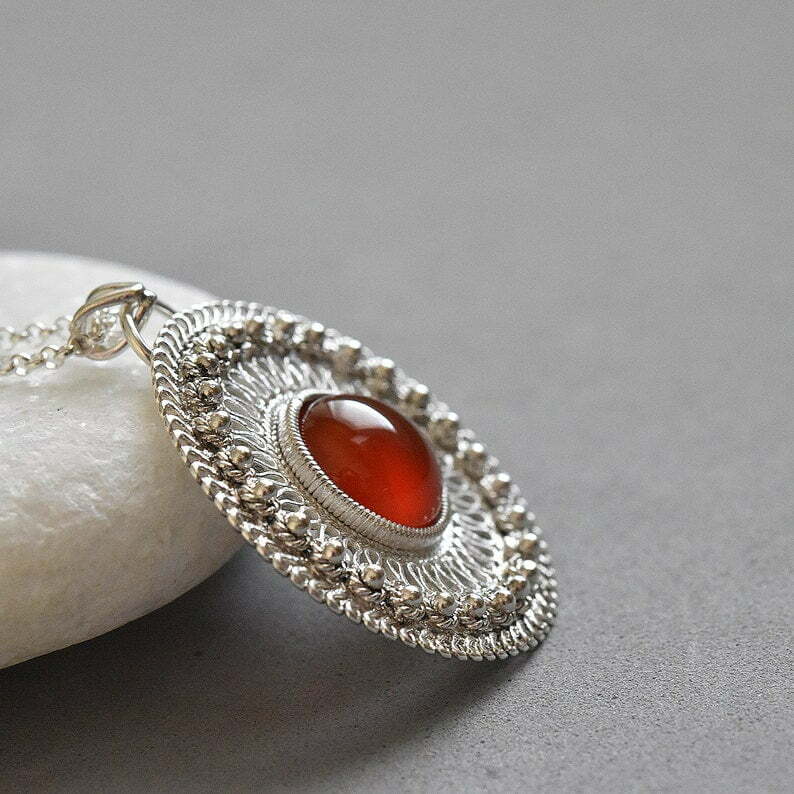 Tags: Carnelian necklace, Ethnic necklace, Filigree silver necklace, Israeli jewelry, Red circle pendant