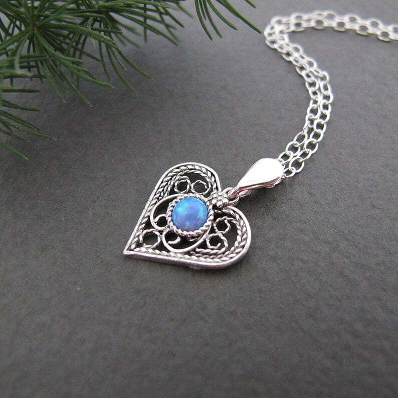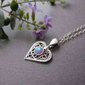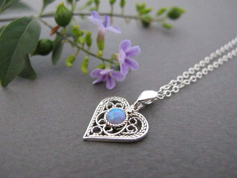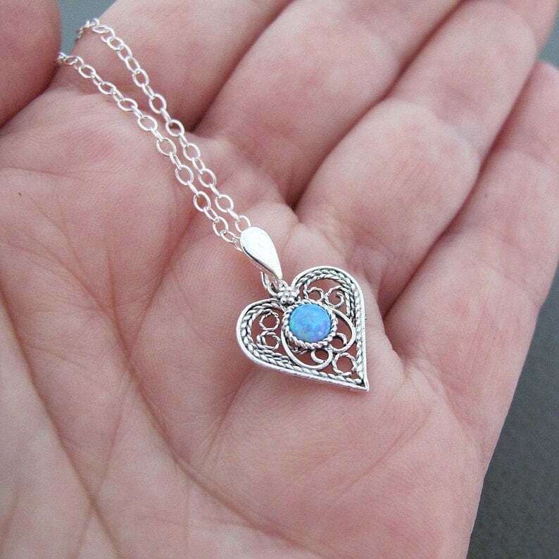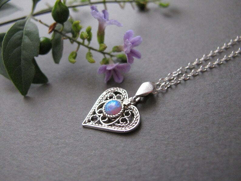 Amazing delicate filigree necklace in the shape of the heart with lab opal stone in the middle will be beautiful gift for every ocassion.
