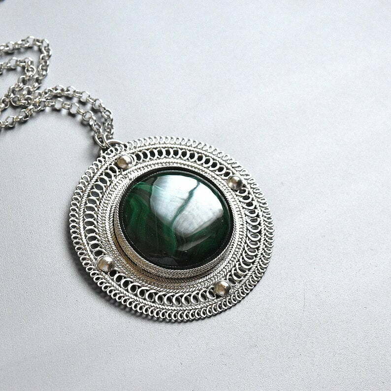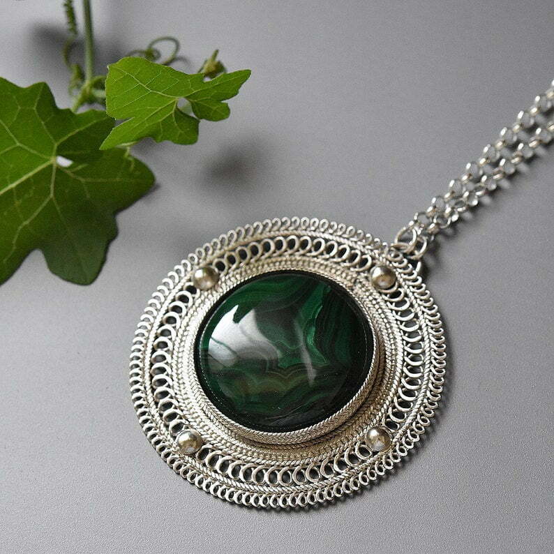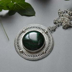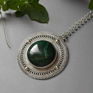 Tags: Circle necklace, Filigree pendant, green stone necklace, Israeli jewelry, Malachite silver pendant