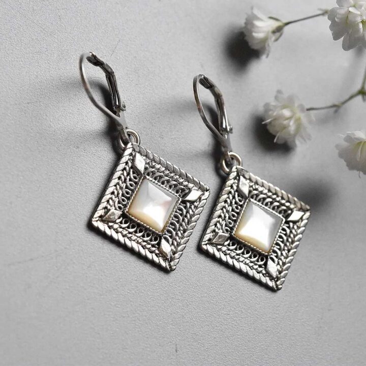 Square Silver Filigree Earrings, Mother of Pearl earrings
