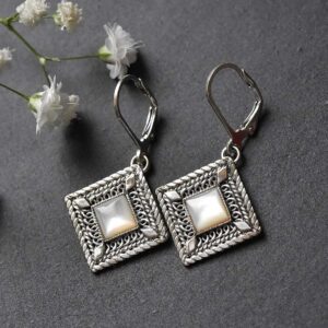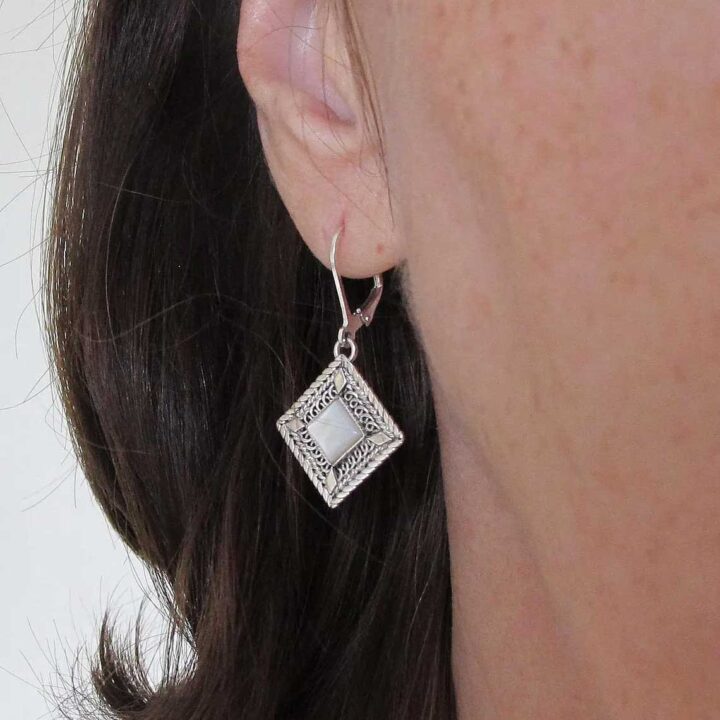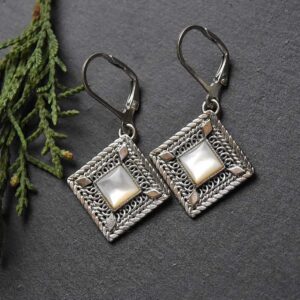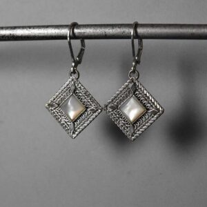 Elegant ethnic silver filigree earrings with small Mother of Pearl square caboshons.